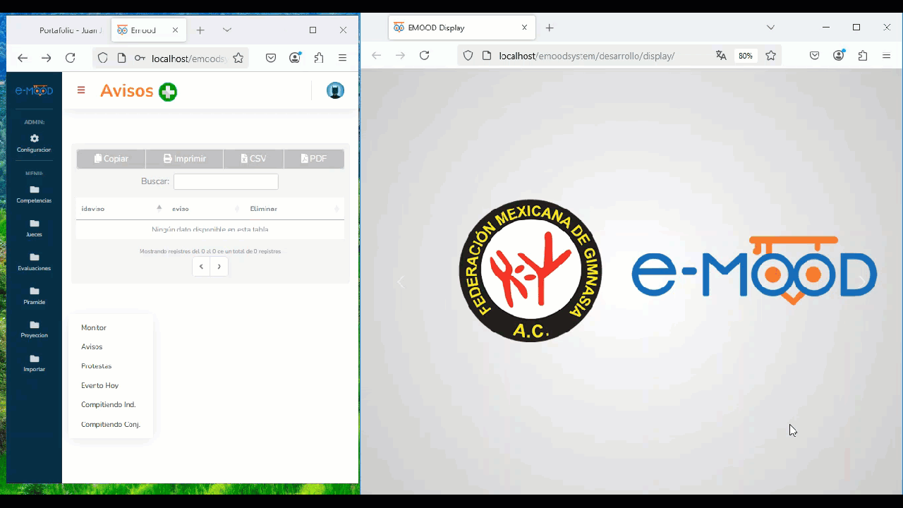 Es un sistema web ejecutado en la red de la federación donde gestiona la competencia de gimnastas, puntuaciones, panel para los jueces donde pueden votar por la gimnasta que esta en ejecutando. Cuenta con un monitor que muestra avisos, la gimnasta que esta participanto y la puntuación resutlante de las calificaciones de los jueces. Todo el sistema es gestionable. Desarrollado en php 8.2, mysql
