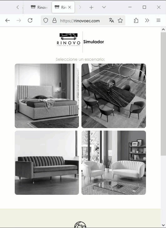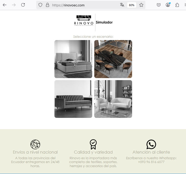 Este es un simulador de telas para la Empresa Rinovo de Ecuador, el proyecto consiste en seleccionar uno de cuatro escenarios; después el usuario puede seleccionar una tela del catálogo disponible, y los escenarios se les cambiara la tela; también puede elegir un diseño de patas que se combina con la tela seleccionada. Una vez que tenga la selección puede pedir información sobre esa seleccion a traves de whatsapp. El proyecto lo programe en php 8.2, mysql, jquery;