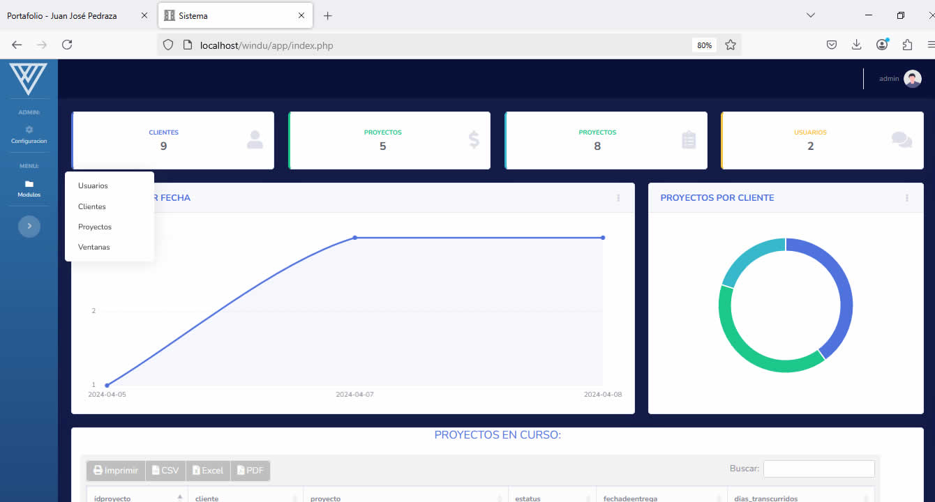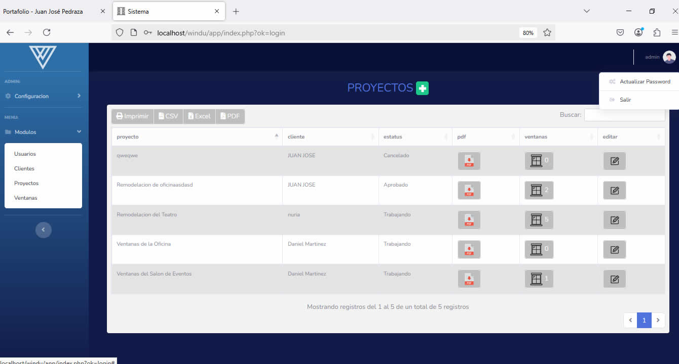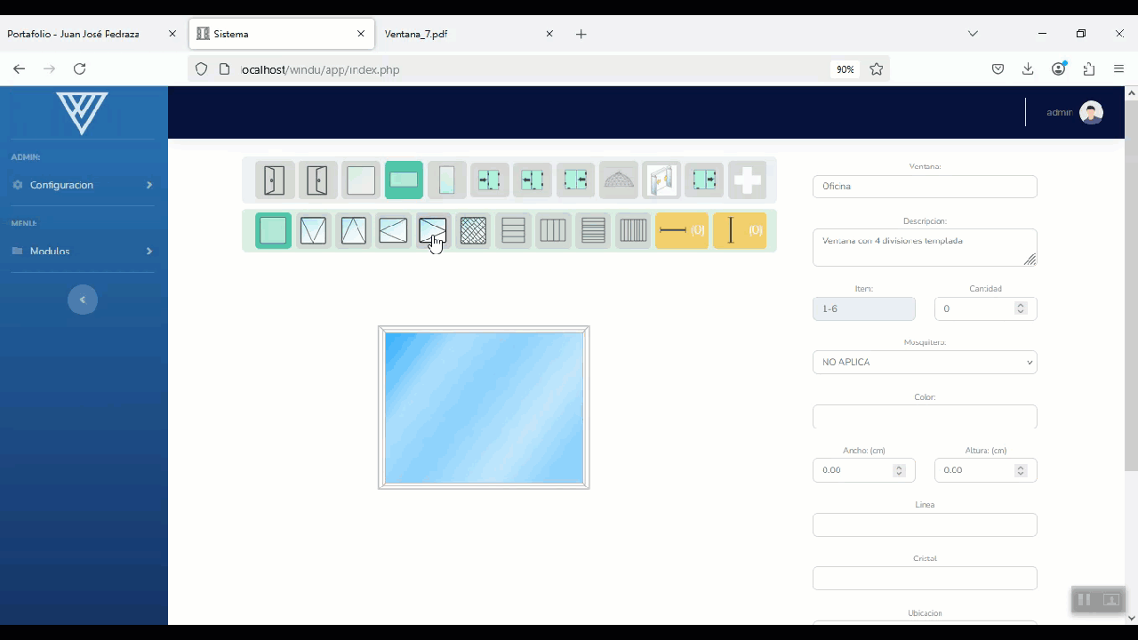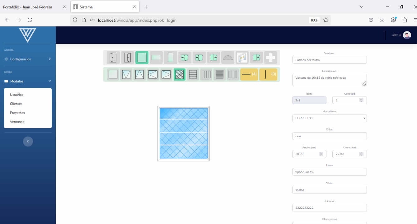 Esta es una aplicación web para el diseño de ventanas, gestion de proyectos y presupuestos pdf. Cuenta con un gestionar de usuarios y permisos; El diseñado de ventanas es muy agil y puede seleccionar entre varios tipos y agregarle divisiones y diseños. Fue desarrollado en php 8.2, mysql y jquery.